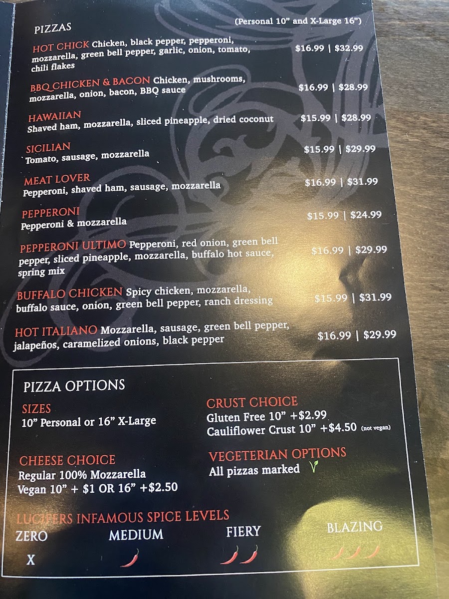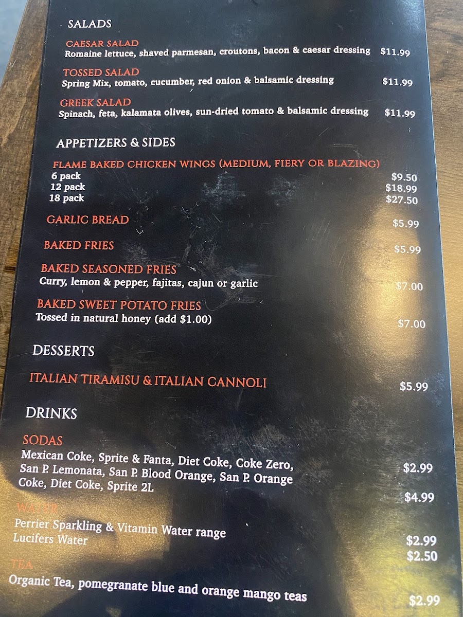 From a reviewer's standpoint, the menu at Lucifers Pizza offers a well-rounded mix of indulgent desserts, fresh salads, and satisfying pizza options that cater to a variety of tastes. Dessert lovers can enjoy NY Strawberry Cheesecake, Italian Cannoli, Italian Tiramisu, or the rich Nutella Cheesecake. For lighter fare, the menu includes crisp Caesar Salad, refreshing Greek Salad, and a simple Tossed Salad. Appetizers and sides like Garlic Knots, Baked Sweet Potato Fries, Baked Sweet Potato Fries With Honey, Baked Seasoned Fries, and classic Baked Fries add a comforting touch to any meal. Pizza enthusiasts are treated to choices like the personal 10" Hot Chick Pizza, 10" Buffalo Chicken Pizza, 10" Pepperoni Pizza, 10" Simply Cheese Pizza, and the larger 16" Simply Cheese Pizza, ensuring both solo diners and groups are satisfied. To complement the meal, a selection of drinks including Vitamin Water, Perrier Sparkling Water, San Pellegrino Can Soda, Lucifers Water, and Sprite 2 Liter rounds out the offerings, while popular add-ons such as Chili Flakes Packet, Side of Ranch, Side of Jalapenos, Parmesan Cheese Packet, and Side of Marinara Sauce allow diners to personalize each dish. Overall, the menu strikes a balance between classic pizza favorites, indulgent desserts, and thoughtful sides, making it clear that Lucifers Pizza prioritizes both flavor and variety.